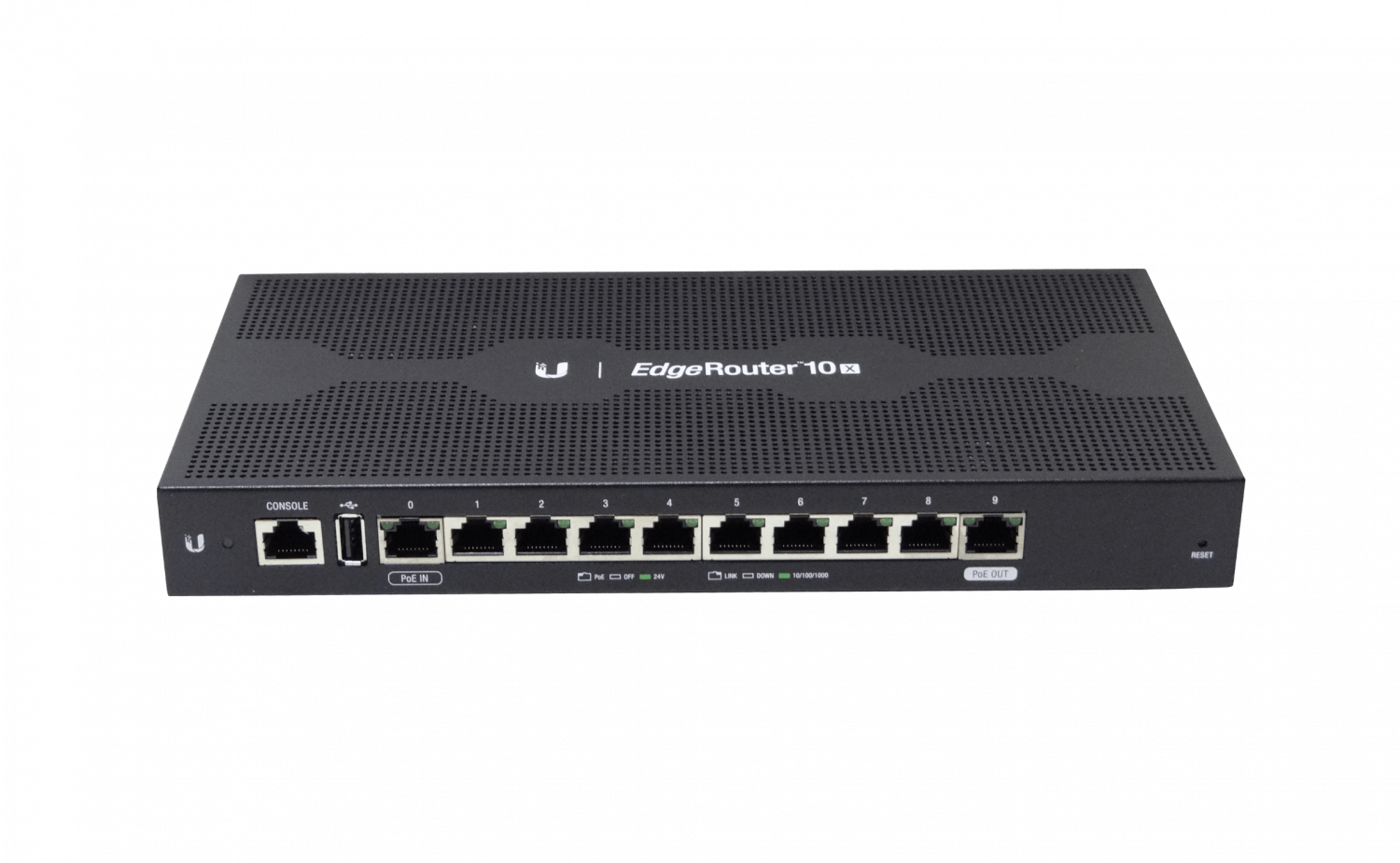 Con un alto valor de precio/rendimiento, el EdgeRouter 10x es un enrutador Gigabit avanzado con flexibilidad PoE, muy util para WISP. Los diez puertos Gigabit RJ45 ofrecen conectividad de cobre, con entrada PoE (PoE IN) en el puerto 1 y salida PoE en el puerto 10 (PoE Out) . Dos puertos SFP ofrecen posibilidad de conectividad por fibra. Para una configuración escalable, use EdgeOS® o el sistema de gestión de red Ubiquiti® (UNMS).
