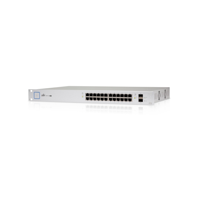 Switch Administrable L2/L2 PoE de 24 Puertos RJ45 10/100/1000Mbps y 2 SFP GE, con capacidad PoE de hasta 500 watts de potencia trabajando: 24v(pasivo) y 48v 802.3af/at, se integra a la administración centralizada del UniFi 4.0, soporta Vlans, 1RU rackeable, administración WEB y CLI, capacidad de Switching de hasta 52Gbps